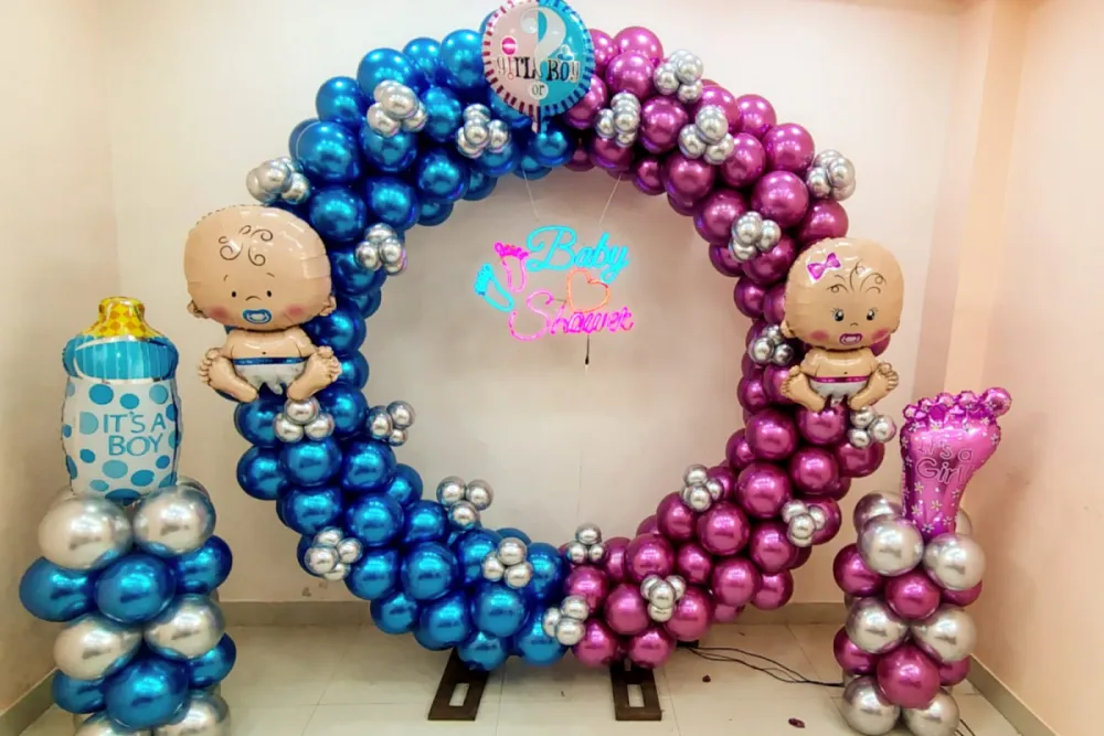 Discover the best ideas to celbrate your baby shower day with balloon decoration, we belive in making peples spcial day unforgettable for them and this baby shower ring set up is one of them. perfect color combination of blue and pink chrome balloons and adding baby props give a whole new vibe to it.