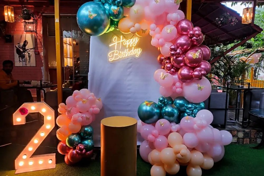 Make Your birthday More Special with This amazing birthday decoration with pastel and chrome balloons and neon lights decoration.